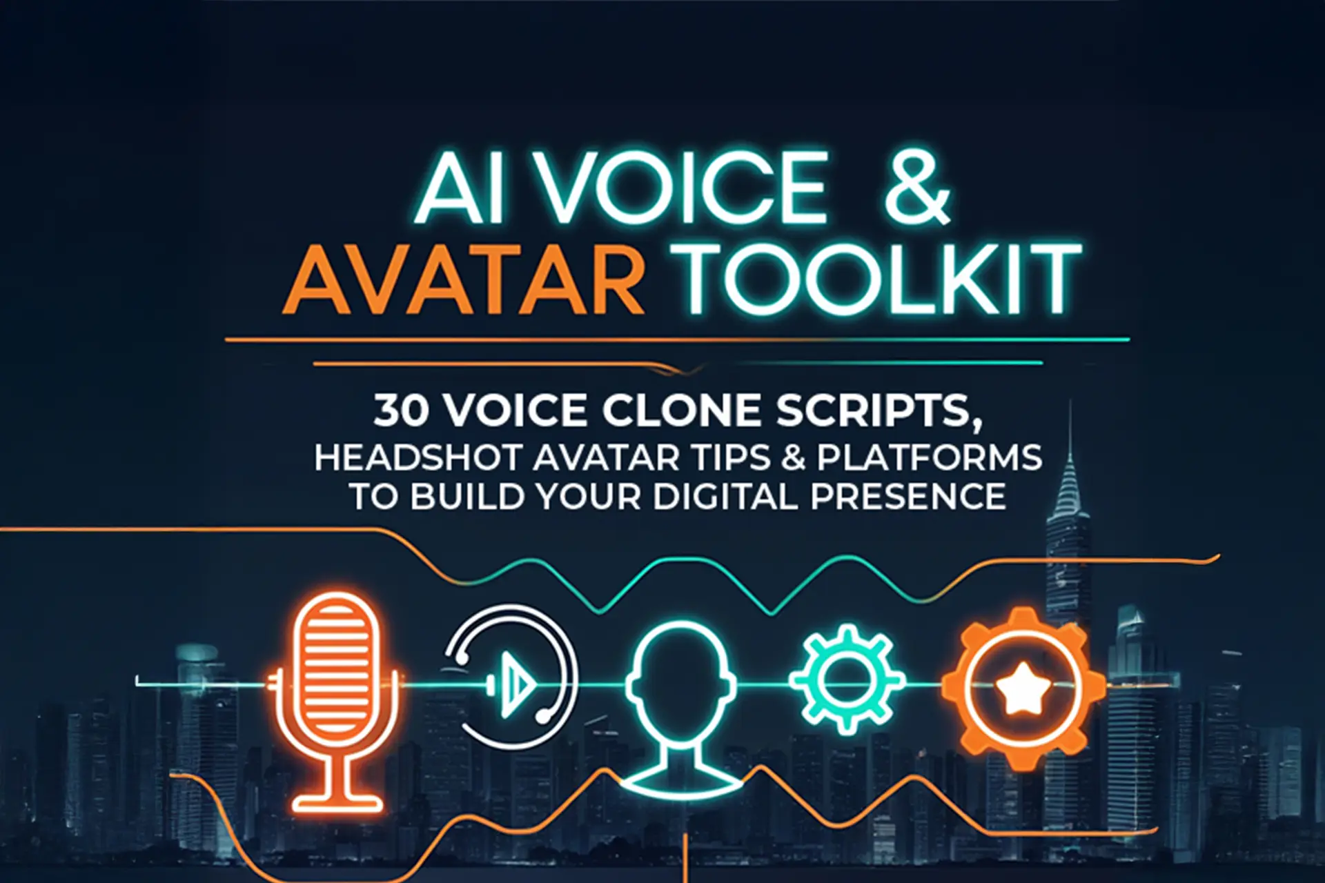 AI Voice & Avatar Toolkit with 30 voice clone scripts, headshot tips & platforms to build a professional, authentic digital presence.